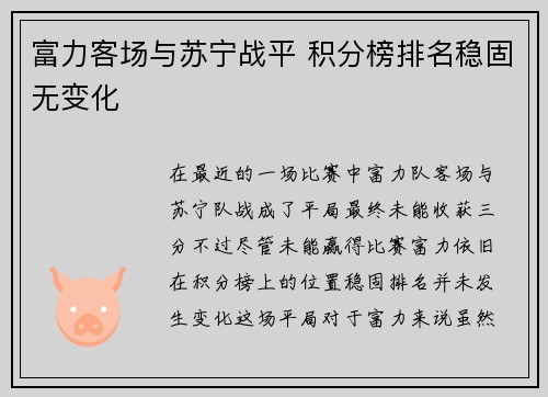 在最近的一场比赛中,富力队客场与苏宁队战成了平局,最终未能收获三分。不过,尽管未能赢得比赛,富力依旧在积分榜上的位置稳固,排名并未发生变化。这场平局对于富力来说,虽然不能完全令人满意,但从长远来看,对球队的整体竞争力并未造成太大的影响。通过分析这一场比赛的整体表现,可以从多个角度进一步深入探讨富力的现状以及未来的潜力。