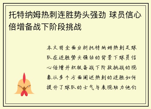 本文将全面分析托特纳姆热刺足球队在连胜势头强劲的背景下,球员信心倍增并积极备战下阶段挑战的现象。从多个方面阐述热刺的连胜如何提升了球队的士气与表现,助力他们迎接更为艰巨的赛程。首先将从球队的战术革新谈起,其次分析球员个人状态与团队配合的提升,再者探讨教练的策略调整以及球队管理层的支持,最后讲述球迷与媒体的影响,如何形成一个良性循环,推动热刺迎接更加严峻的挑战。本文力图呈现出托特纳姆热刺在现阶段的强劲势头如何为未来的比赛奠定坚实的基础。